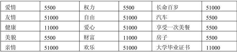 注意: 同学们先讨论自己的价值观,自己最想要的东西是什么,然后根据其共同价值取向分成6个小组。每组8或9个人。拿出纸笔将想要的东西按其重要性排列,并且对它们全部定价,你认为它值多少钱就定多少。例如亲情3000元,快乐3000元,爱心1000元等。