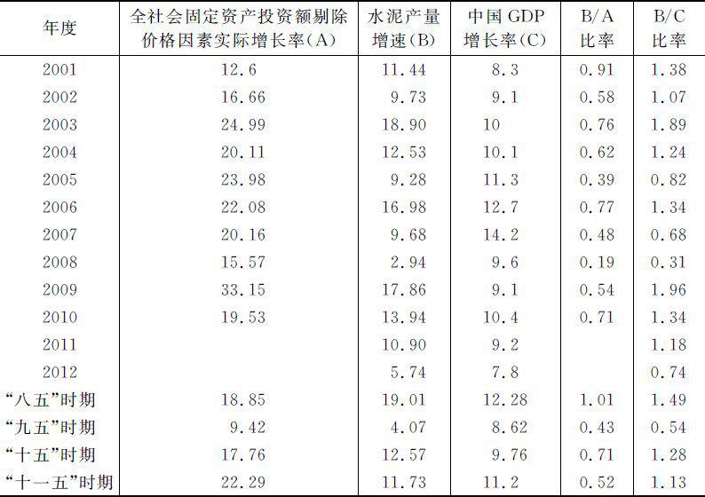 表3-2 水泥产量与GDP增长率、固定资产投资增长率的比率