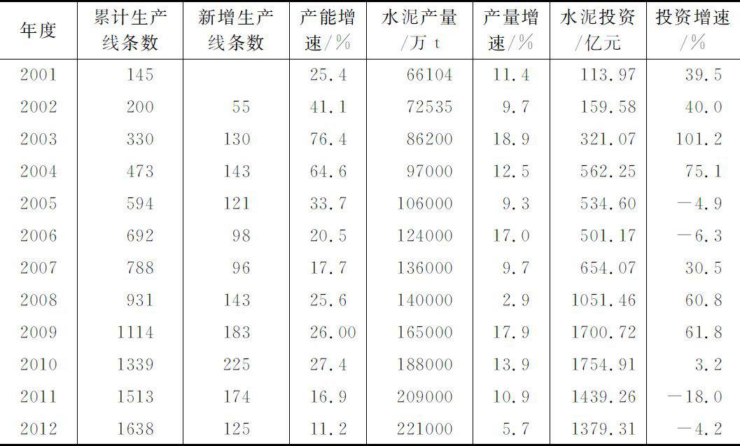 表3-1 水泥产能增速、产量增速与投资增速(2001—2012年)