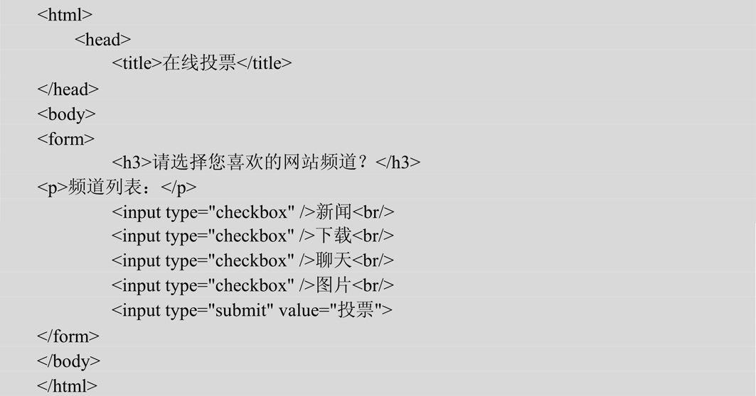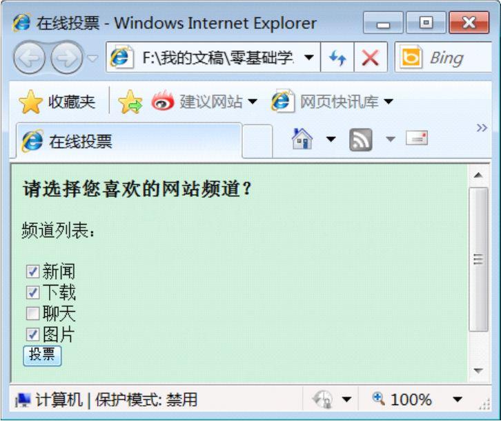 代码说明:该程序由HTML表单的组成,包括一个标题、4个复选框和一个提交按钮,这些内容和标记均被包含在表单标记之间。该网页运行效果如图1-2所示。