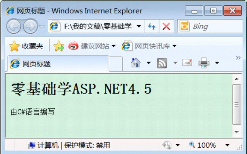 代码说明:该程序包含一个标题和一句文字。其中标题包含在标记<h1>和</h1>之间,文字包含在标记<p>和</p>之间。图1-1显示了该静态网页文件被浏览器解析时的情况。