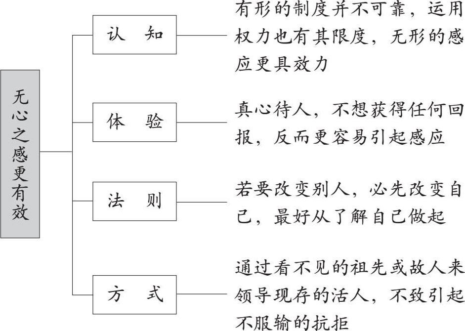 领导者对被领导者,完全是真心相待,不想获得任何回报,不会发生“我对你这么好,你怎么可以这样对待我”的责难。只有给予,不求回报。这种无心之感,令人倍感亲切,反而能引起更多、更大的回应。