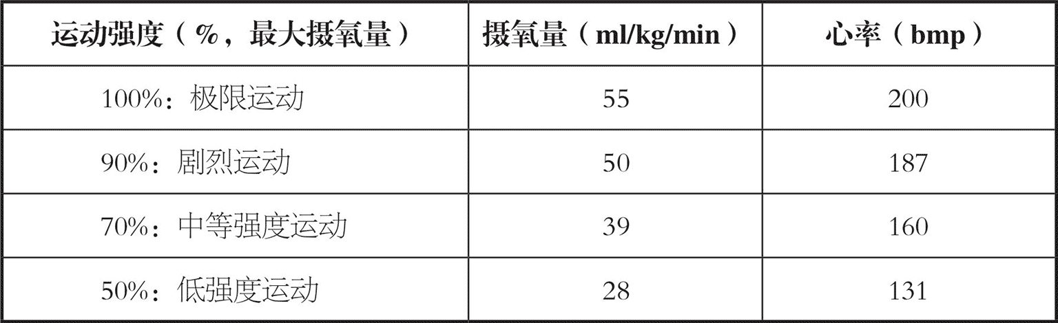 表3-1以一个20岁的海豹队员为例,阐述运动强度、摄氧量、心率之间的相互关系:他的最大摄氧量为55ml/kg/min,心率为200bmp;进行低强度运动时,他的摄氧量为25~30ml/kg/min,心率130bmp;而进行剧烈运动时,他的心率为180bmp左右。确定训练的运动强度之前,首先要测算出最大摄氧量和最大心率。