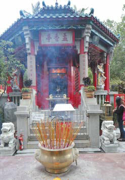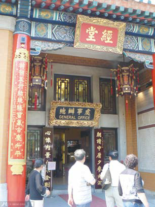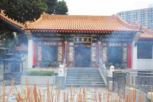 香港黄大仙祠正殿是香火最为鼎盛的一处,正殿延续了中国传统寺庙建筑风格:红柱金顶,蓝楣黄格。主祭坛中央供奉着黄大仙的画像,祭坛背后刻有一件木雕作品,上面详细记述了黄大仙得道成仙之事。正殿墙壁上处处是道、释、儒三教的木刻经文和精美图画。