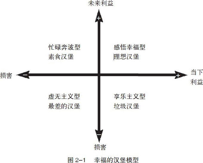 整整一个月来,我是多么期盼这一刻的到来。然而当汉堡就在我面前时,我居然不想吃了。我努力思考这是为什么,就在那时,我的脑海里形成了所谓的“幸福模型”,我更愿称它为“汉堡模型”。