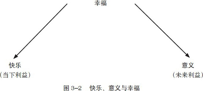 我们可以把这个解释与“感悟幸福型”相连:快乐代表现在的美好时光,属于当下的利益;意义则来自于目标,一种未来的利益(见图3-2)。
