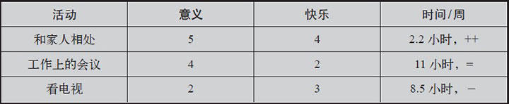 在每个星期结束时画一个图表,上面包括你所做的事情,它们所带来的意义和快乐,以及你所花的时间(你可以为它们带给你的快乐与意义评分。比如说-5分是最低分,而5分为最高分)。在所用时间旁边,注明你希望以后用更多还是较少的时间在这件事情上。如果希望用更多的时间就写个“+”,很多时间的话就写“++”,减少就用“—”,保持用“=”。下面是一个图表的例子: