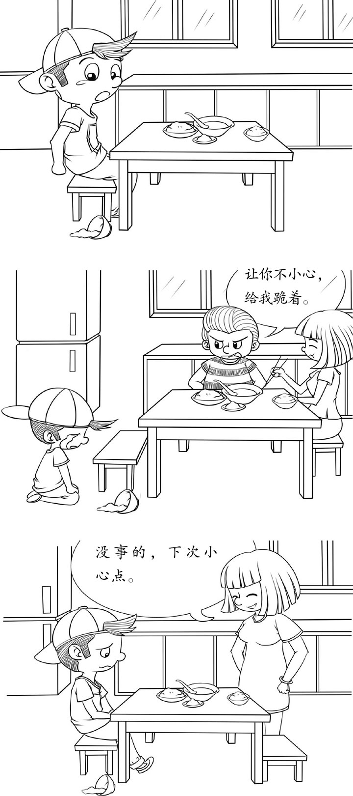 我们面对孩子犯错时,往往会走入误区,用成年人的标准去衡量他们所犯的错误。却忘记了站在我们对面的还只是个孩童,没有足够的应变能力和自信。在这样的情况下,我们该做的是给予他们鼓励与支持,增其信心,而不是如图中父亲一样打骂或体罚。