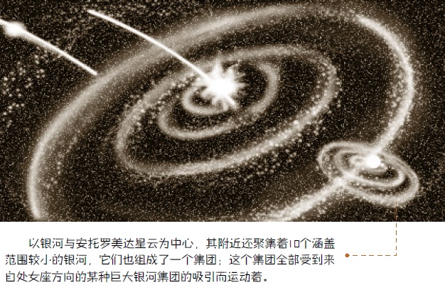 地球是绕着太阳运转的,而太阳也是从2亿至3亿年前就开始绕着银河系中心附近而运转的,而银河系本身也是受到相距2亿光年邻近的安托罗美达星云吸引而运转的。这些都是众所皆知的事。更有甚者,以上所述提及的银河与安托罗美达星云为中心,其附近还聚集着10个涵盖范围较小的银河,它们也组成了一个集团;这个集团全部受到来自处女座方向的某种巨大银河集团的吸引而运动着。