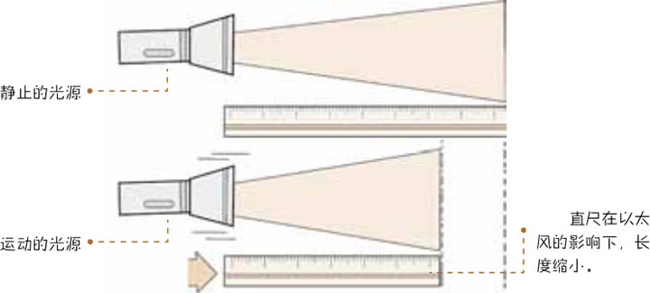 在爱因斯坦之前,曾有科学家提出关于“运动中的物体长度会缩小”的观点。他们认为,物体之所以运动,就是以太风对物体中分子产生压力的结果。由此,我们可以推断,光速也应该会发生变化。而且,与此同时,测量光速的直尺也在发生变化。 |