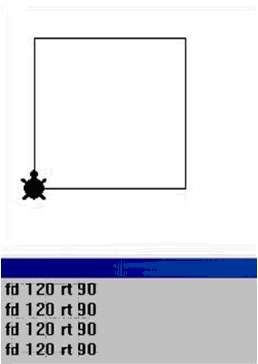 非常有趣的是,终生幼儿园团队更多的成员是工程师而非教育者,他们的硕士生,大多是研究技术,而博士生,则更多地研究教育,这可能是麻省理工学院作为一个传统的技术学院在这个团队当中留下的烙印,也可以说追求技术和教育的最优学习方案,一直以来都是这个团队的追求目标。这只小海龟就是著名的Logo语言,小海龟按照下面的代码,依次执行前进120步,右转90度的指令,当执行四次以后,小海龟回到原点。