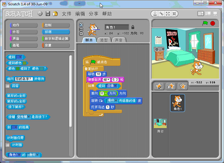 除此之外,Scratch软件还可以感受外界环境变化,并且作出反应,就像人一样能够对外界刺激做出反应一样,这个过程是通过传感器板完成的。例如,它会感受滑杆传感器当前的数值,并且把这个数值,转变为自己的旋转角度,除了可以控制自己的旋转,还可以控制一个真实的马达旋转的时间,这就使得该软件不仅是一个虚拟世界的软件,而且变成了虚拟世界和真实世界沟通的最简单最直观的工具。