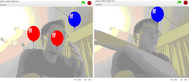 这样,背景中的人,像做打气球的动作时就能够引起程序的反应,气球就自动爆炸了。这种虚实结合的程序效果,以往一般都是在科技馆或者游乐场中才能够体验的,但是现在学生自己就可以构建这个编程环境,制作属于自己的摄像头互动效果游戏,将各种各样奇妙的技术引入到儿童的编程世界当中。这首先是提高了程序教学的趣味性,让学生有更大的投入到程序的设计学习当中,其次也是技术走向平民化,走向每个人的生活,成为一项基本技能趋势的体现。技术仿佛总是在不断进步中,把一个个曾经辉煌的技术前沿应用拉下神坛,事实上,这只是很普遍的一种现象,比如手机从财富的标志到日常的用品。