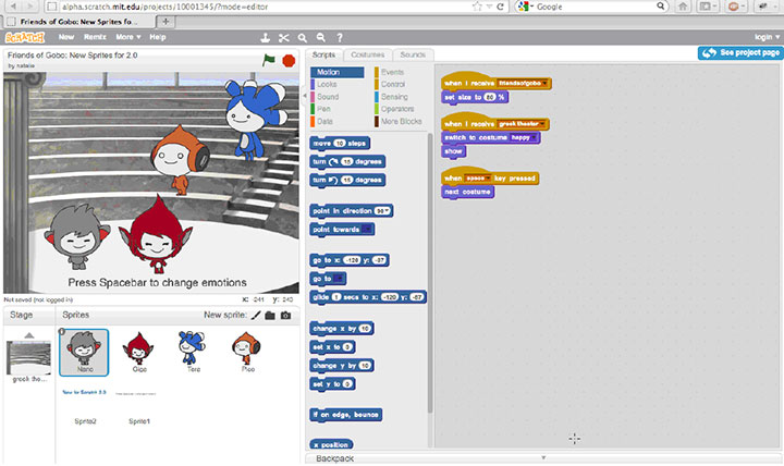 这对于很多中国的学生并不陌生,最初的头脑风暴机器人(MINDSTORM)的编程环境也是像积木块一样的,但是不能够完成比较复杂的程序,更不能和电脑互动。Scratch软件衍生出另外一个版本Enchanting之后,我们就可以用Scratch的形式给它编写程序了。值得注意的是Scratch的1.4版本是一个开放源代码的项目,它允许许多人在基础上进行修改,于是,就有了各种各样的重新改写(Remix),增添了各种奇妙的功能,开源使得知识流动起来,聚集了人气,使得20人的团队可以影响成百上千人的团队,共同协作。