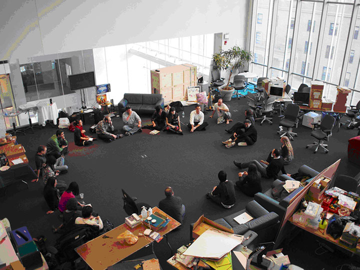 终生幼儿园这个项目隶属于麻省理工学院媒体实验室,是由一群非常具有创造力的人组成的一个项目组,招收硕士生和博士生。这个团队只有二十余人,在麻省理工媒体实验室(Media Lab)中这一群学生和老师有时在设计新的音乐装置,然后学生有时忙着设计新的局域网络软件,忙得整天不亦乐乎。这些活动使得媒体实验室不仅是一个非常好的研究型实验室,而且还是一个非常有趣的学习空间,因为学生在这里是设计、创造和发明新的东西,而并不仅仅是学到知识。这是他们2011年,他们刚刚搬进了新的实验室的一次讨论活动,仿佛他们真的是在幼儿园当中一样,舒服惬意而且平等自由。
