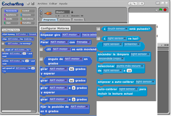 在Enchanting当中,支持所有头脑风暴机器人的输入和输出设备,并且还有自动识别语言的功能,使得各个国家的使用者都能够非常自然、容易地使用类似Scratch软件的语法,给头脑风暴机器人编程。由于开放了源代码,而且这种类似于乐高积木的程序编写方式非常容易被任何人掌握,Scratch软件渐渐地成为一种编程入门的规范,对其支持的各种硬件也越来越多。