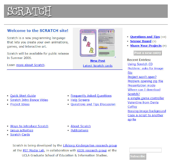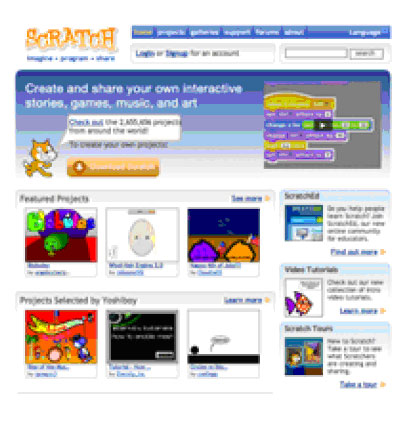 在网络时代,每款软件都有对应的网站,上图是最早的2006年的软件的网站,可以看到那时的网站,只是一个一般的介绍型网站,还没有对应的社区服务。但是,从一开始,Scratch软件就有对应的传感器板,可以说,软件和硬件的综合使用一直都是Scratch软件的设计灵魂,在此之后,Scratch软件网站增加了社区功能,从本地计算机的程序上传到网络社区分享。