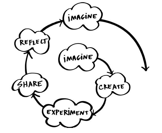 从Logo语言的发明之初就不仅仅是作为一个学习计算机编程的简单语言,而是希望颠覆学生学习数学的方式,可惜这一切都没有发生,但是留下来一个学习模型,这个模型贯穿着整个终生幼儿园团队开发的所有项目。在该模型当中,学习的步骤是从一个设想开始,之后依次是创造、实验、分享、反思,最后还会回到一个新的设想。