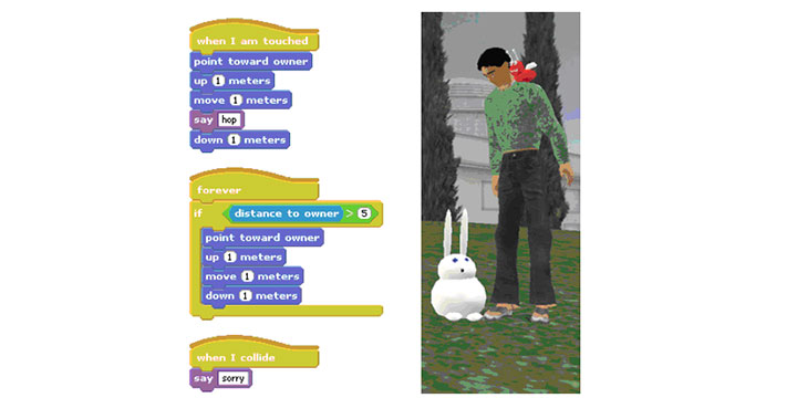 如上图中的白兔,当距离主人一定距离后就会蹦蹦跳跳回到主人身边,而这个程序是通过,第二人生软件环境之外的Scratch软件实现的。在这个过程当中,Scratch软件和第二人生软件之间的信息是相互连通的,由于Scratch软件是一款开放源代码的软件,因此许多团队为其增添新的功能,实现更好的互动效果,许多之前普通人遥不可及的控制效果,比如通过互联网控制一盏台灯,都可以通过Scratch软件的接口软件完成,这样物联网进入小学课程将不再是遥不可及。