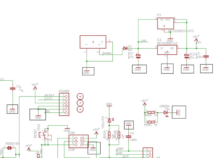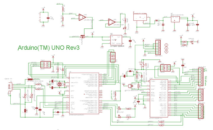 如果了解了上面的规则,我相信,即便看不懂整个Arduino R3的电路图。可是,每个电子元件的连接情况,相信大家都会明了吧?