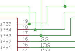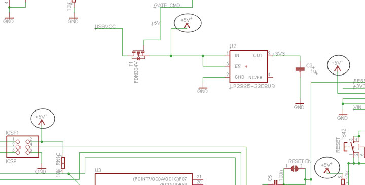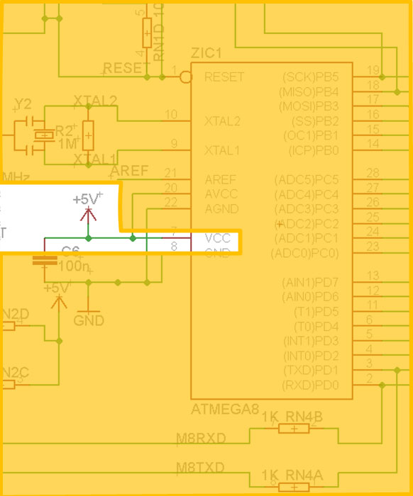 如Arduino Uno R3的电路图中,所有的如下图圆圈中的VCC图标,其实都是连接在一起的,都连接到了+5V电源上: