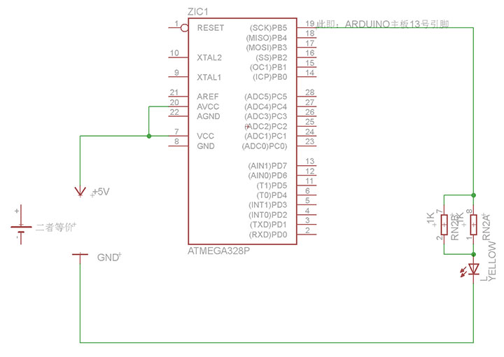 即,对照标可控电路原型,Arduino Uno R3的L灯的电路原理图可以作如下归化:电源:+5V和GND实际上构成了电源的正负两极。电源在原图中被抽象成了正负两个图标。用电器:实际上,是两个电阻的并联和LED灯共同作为用电器而存在。开关:开关哪里去了?实际上,我们可以将ATMEGA芯片看做是一个开关,或者说,在VCC引脚和PB5(也就是Arduino的13号引脚)引脚之间的芯片内部,有一个能够被ATMEGA328P芯片控制的开关。