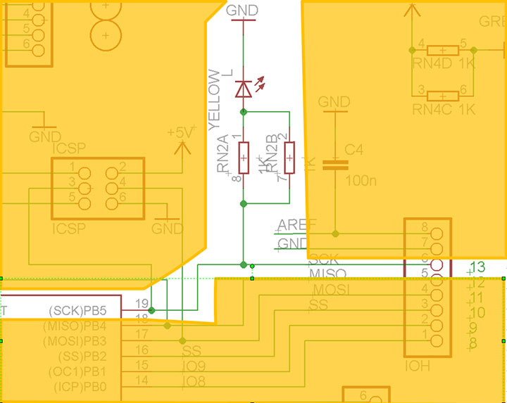 抠出来的部分如果加以整理,实际上,我们得到的是如下的观察结果:从芯片的PB5引脚连接出来,然后同时连接到排母IOH上的13号引脚上以及一个并联电阻上,根据等价原则,PB5引脚其实就是Arduino主板的13号引脚。并联电阻编号为RN2A和RN2B,每个为1KΩ(1000Ω),套用并联电阻计算公式,它们两个等效于一个电阻等于500Ω(欧姆)的单电阻。在通过并联电阻之后,电路连接到LED,再通过LED连接到了GND。如果只讲到这里,相信大家会发飙:这如何被归化到完整的基本可控电路中去?开关呢?电源的正极呢?好吧。实话实话,我们其实只抠完了一半。还有一半没有抠完,我们继续抠另外一半,它的截取部分如下: