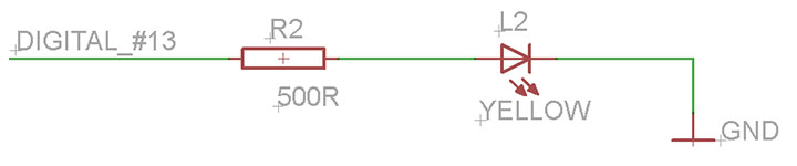 Arduino L灯的电路原型及归化到可控电路原型的方法还记得在第二卷里被我们反复折腾的L灯么?其实它的电路图就可以被归化到可控电路原型中。下面,我们就将Arduino相关于L灯的电路原理图从整个电路中抠出来,然后尝试将其归化到可控电路原型的框架内去: