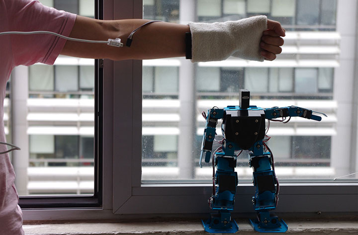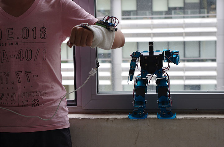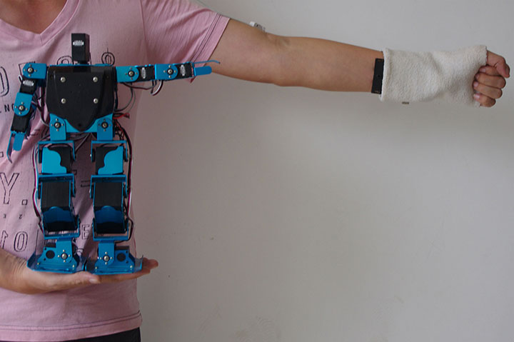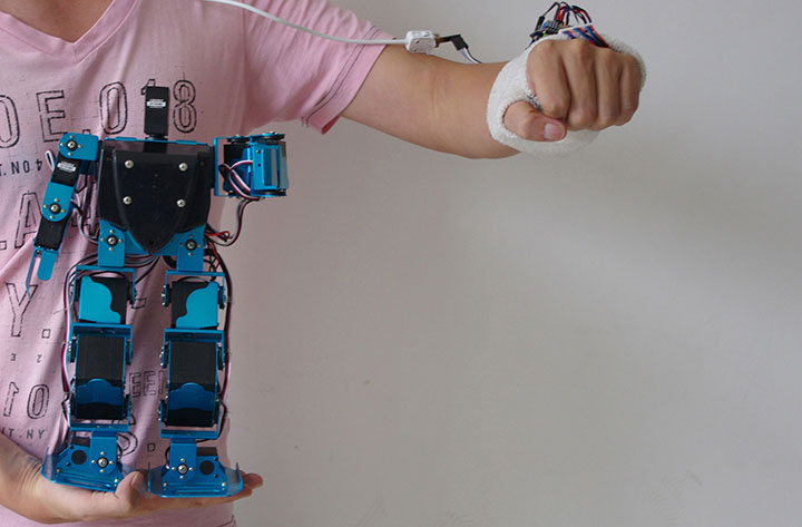 在用手柄玩了一段时间格斗机器人之后,制作过程参见前两期的文章,这次本人在控制器方面又进行了一次升级。不再使用类似游戏机的手柄,而是自制了一个臂带式体感交互控制器。