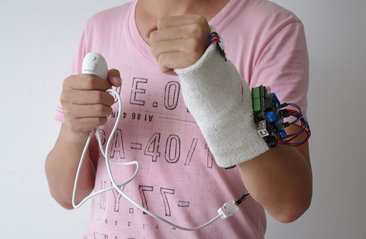最后将Wii的副手柄numchuck接上,并将其握在右手内。如图6所示,这样,我们的臂带式体感交互控制器硬件部分就算完成了。