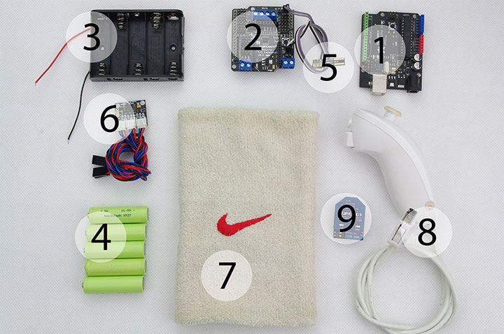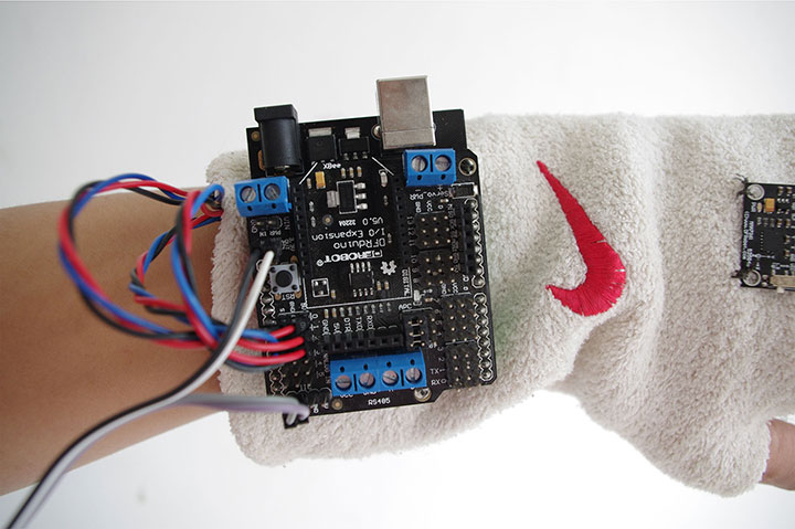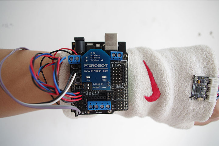 先来说说硬件的连接,首先将护膝带在左手手腕上,为什么选择一个护膝而不是直接用一个护腕呢,这是因为护膝内和手臂的空间比较大,制作起来比较方便。而如果是用护腕则是完全勒在手腕上的。