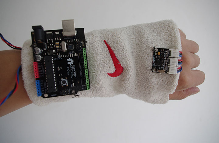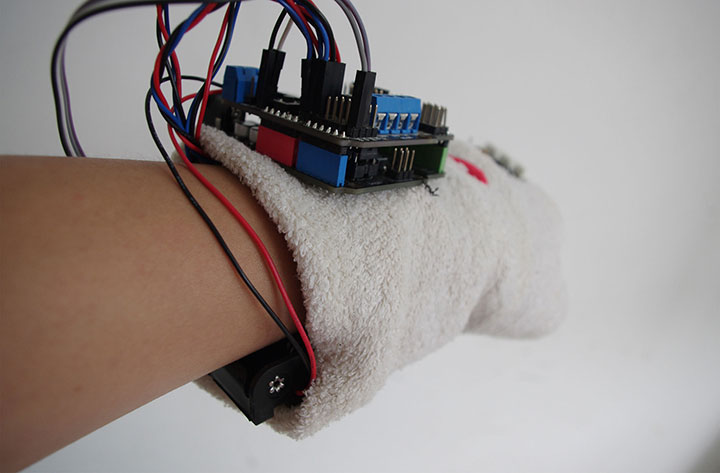 将护膝带到虎口位置即可,并将虎口的位置缝合起来,使其更像一个手套。同时把Arduino控制板和加速度传感器缝在护膝上,如图2所示,加速度传感器的连接线从护膝内穿过。