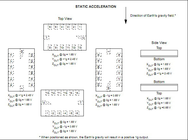 我们使用的是1.5g的量程,上图中给出了静态加速度传感器几种状态下的各个轴向加速度的值,由于量程是从-1.5g到+1.5g,所以当加速度为0g时,引脚输出的电压大致为1.65V,再因为有重力的关系,所以方向向下的轴向上加速度值是1g(根据方向的不同可能是+1g或-1g)。我们可以通过如下的代码将传感器输出的模拟量值转换为电压值(以X轴为例)。