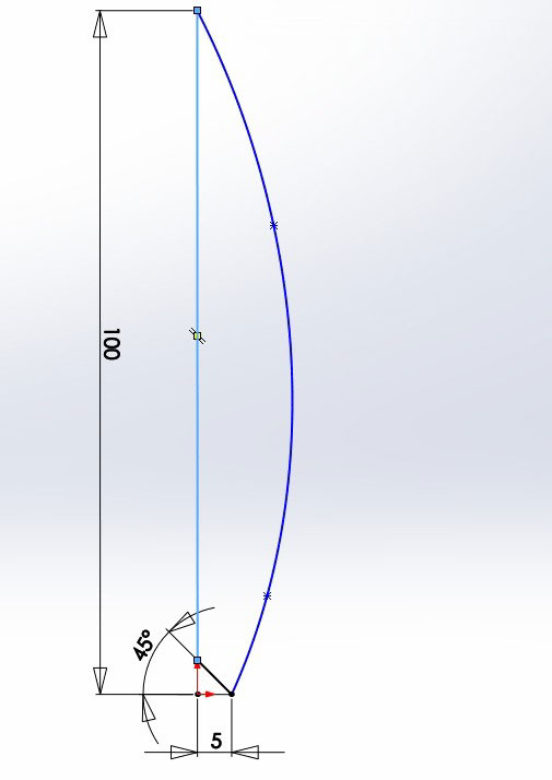 3. 从样条曲线的末端点,斜向左绘制一条与5mm直线夹角为45°的直线,这是为了防止底面锤丝;然后从样条曲线的起始端点向下绘制一条直线,直线与100mm构造先重合,与45°斜向上的直线相交。