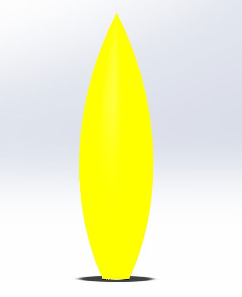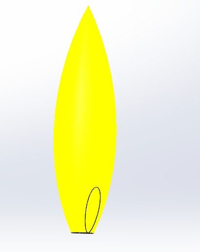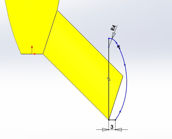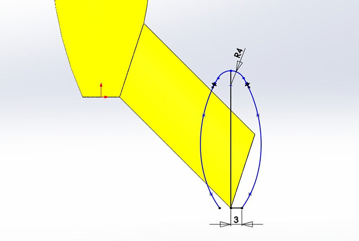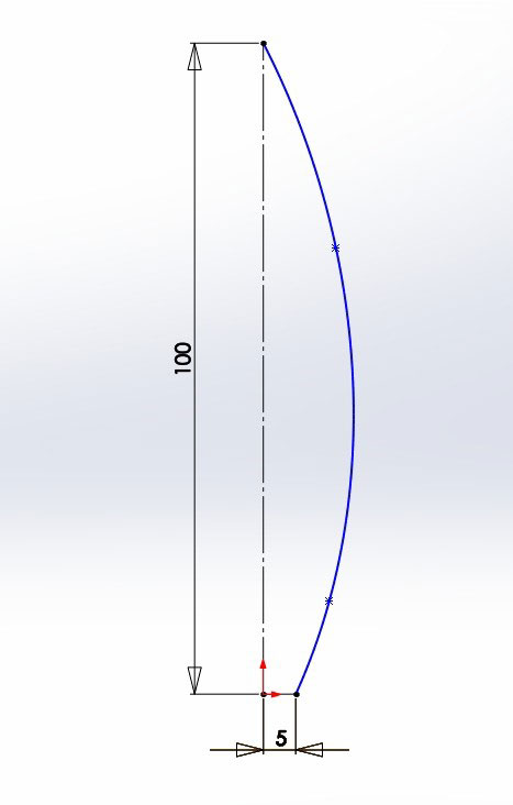 9. 以右视为基准面,绘制草图,左键单击草图选择正视于,以步骤8中扫描结果的下端点为起点,向上绘制竖直直线,长度为40mm,以同样起点绘制水平向右长度为3mm的直线,以40mm直线上端点为起点,3mm直线右端点为终点绘制样条曲线(轮廓自定,与火箭身体要求一样),以40mm直线为中线,镜像该样条曲线,在顶部绘制圆角半径为4,再使用剪裁实体将左半部分剪掉。