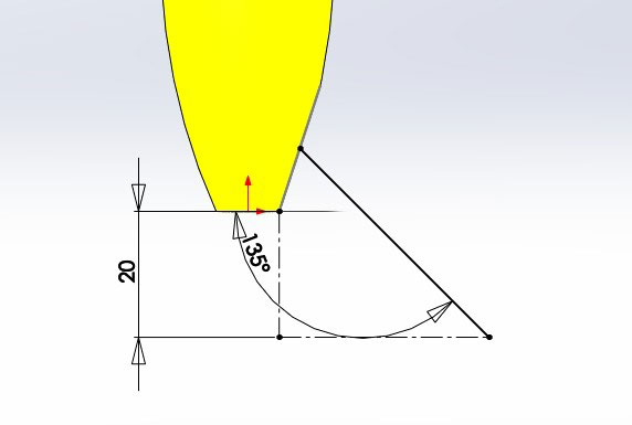 7. 以步骤6中切割出来的平面作为草图平面绘制草图,选择草图工具中的转换实体引用功能,点击步骤6切割出的平面轮廓将其引用为草图轮廓;退出草图,以右视为基准面绘制草图,绘制一条直线,该直线与火箭底面夹角为135°,从火箭底面到直线下端点竖直距离为20mm。