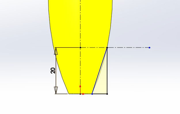 5. 选择绘制草图,以右视为基准面绘制草图,以原点为起点、火箭身体顶端为终点绘制构造线,并在离原点20mm处绘制一条水平的构造线,再由水平构造线与火箭身体轮廓线的交点为起点,到火箭底面轮廓右端点做直线,以此两点绘制一个直角三角形。
