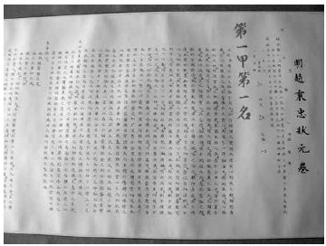 古人参加科举考试要经过乡试、会试、殿试三个阶段。殿试又称“廷试”,考场设在宫殿之上,由皇帝亲自主持,是科举的最高考试形式。殿试录取之后,朝廷发进士榜,诏告天下。古代,黄色是帝王的象征,进士榜即是用黄纸填写,表里二层,犹如黄灿灿发光的金子,故称为金榜。明朝规定,参加殿试的人只分等第而不落选,评卷官会将所有考生的试卷分成三等,着重从中挑选出一甲的三份卷子,其余分等则无关紧要。殿试发榜分三甲:一甲三名,即状元、榜眼、探花,合称“三鼎甲”,赐进士及第;二甲、三甲若干人,第一名称为“传胪”,赐进士出身。