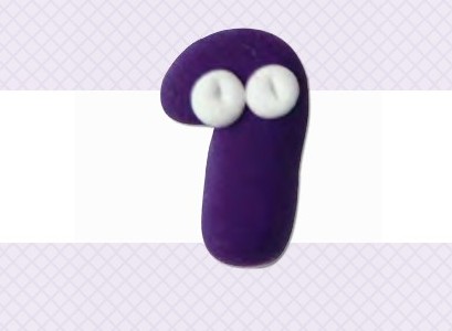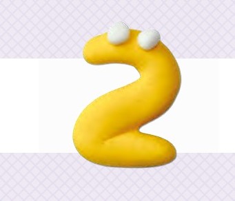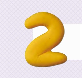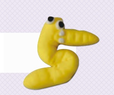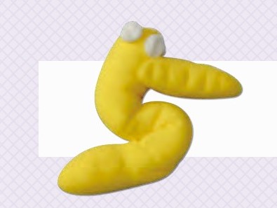 1 取黄色彩泥捏成数字“5”的形状,将白色彩泥捏成小圆饼,粘在数字“5”上。