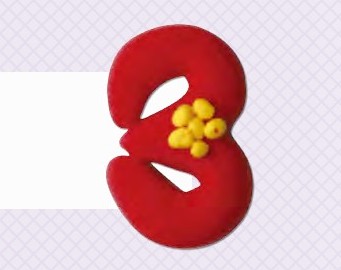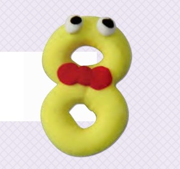 3 用红色彩泥捏出小领结,粘在数字“8”上。