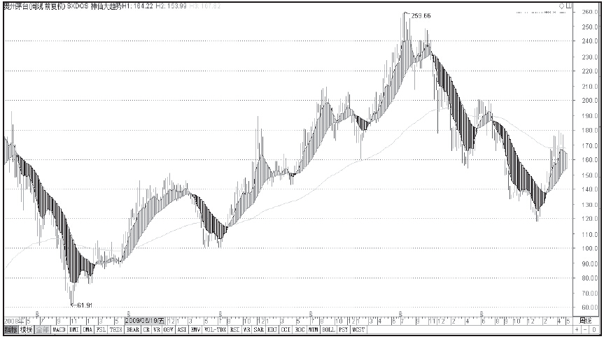 实战案例波段强牛贵州茅台(600519)的周K线趋势图如图3-7所示: