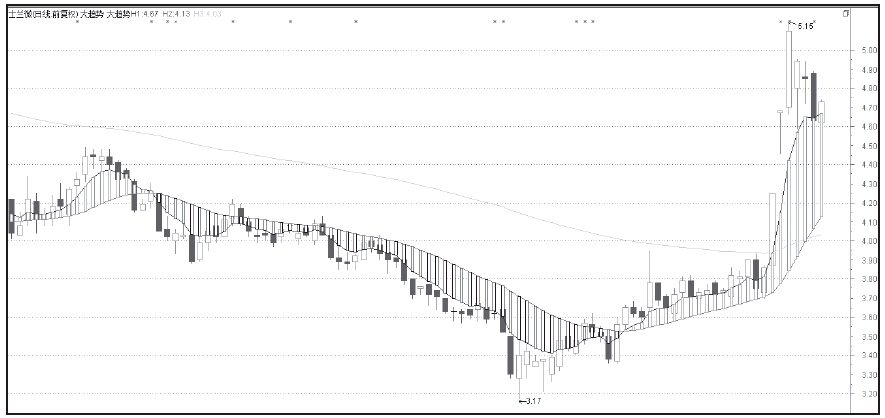 士兰微(600460)主要经营电子元器件、电子零器件及其他电子产品的设计、制造和销售。其进出口业务主要产品包括集成电路,器件,发光二极管等。该股于2012年拟非公开发行不超过17000万股(含本数)A股,且不低于6000万股(含本数)A股,发行价不低于4.19元/股,募集资金总额不超过87995万元。虽然该股还这没有真正发行,但是实际的发行价格远高于当时的市场价格,存在套利空间,存在炒作预期,股价也容易暴涨。2013年1月15日便启动了行情,并且是连涨三个板,赚钱效应明显。