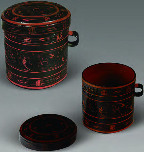 卮通高16、口径15.2厘米。木胎、筒状,一侧设圆鋬,上置扁平盖。器外满髹黑漆地,朱漆绘大幅气纹。漆卮造型优美,纹饰清丽,是汉代实用漆器的精品。