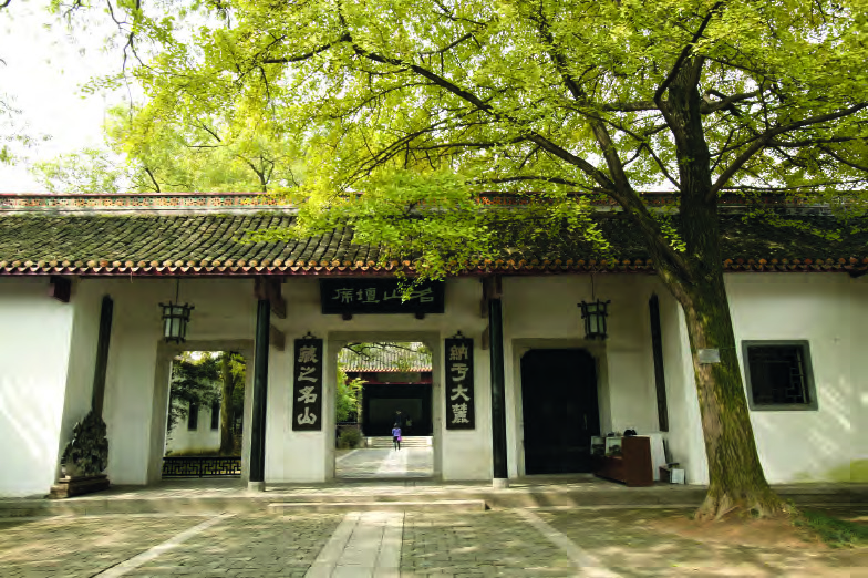 岳麓书院二门上悬“名山坛席”匾额。“坛席”即坛位,除地为坛,上设席位,以示生徒对老师的尊敬。门联是“纳于大麓,藏之名山”。上联出自《尚书·舜典》“纳于大麓,烈风雷雨弗迷”,下联出自《史记·太史公自序》“藏之名山,副在京师,俟圣君子”。
