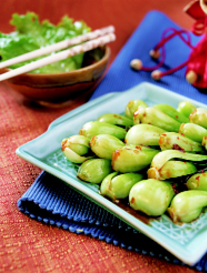 1. 将小油菜去蒂,洗净,再对半切开,备用。