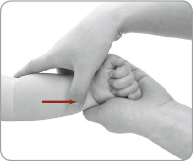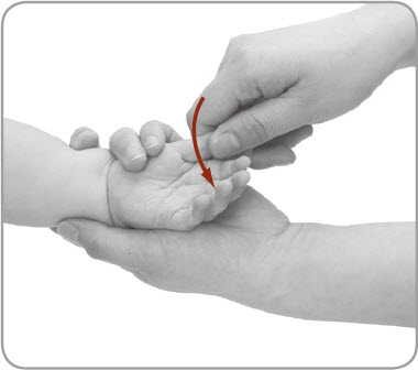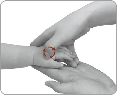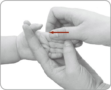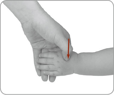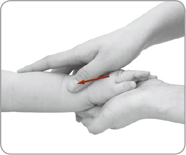 按摩者用一手托住小儿手,一手拇指指甲重掐并揉小儿合谷穴(虎口部第一、二掌骨间凹陷)3~5次。