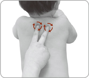 按摩者用食、中二指的指端在小儿肺俞穴上(第三胸椎棘突下旁开1.5寸)回环揉50~100次。