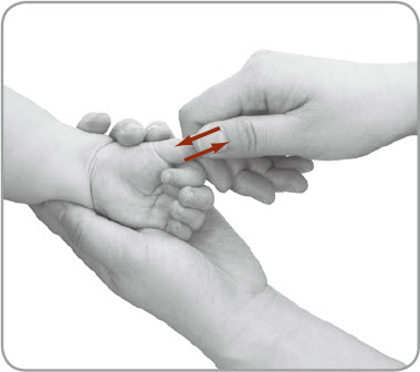 按摩者使小儿掌心向上,以另一手拇指螺纹面自小儿中指指端向指根的方向推50~100次。