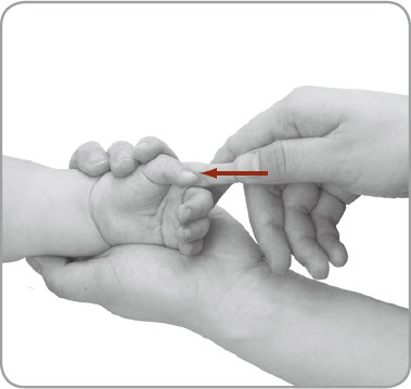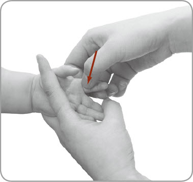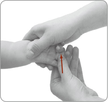 按摩者以一手握小儿的手,使其掌心朝上,以另一手拇指指甲掐小儿胆经(食指掌面近掌节)3~5次。