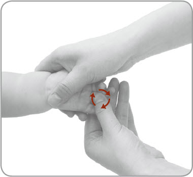 小儿坐位或仰卧位,按摩者以一手握小儿的手,使其掌心朝上,以另一手拇指端揉小儿三焦(无名指掌面近掌节)50~100次。
